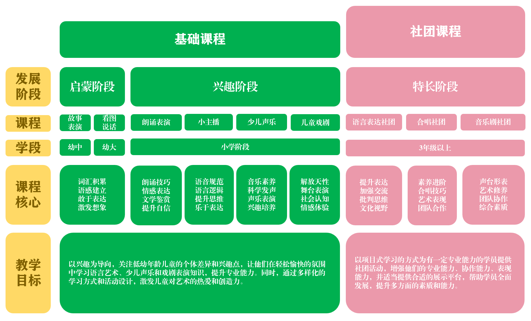 发布时间:2024-11-08 09:55:15.0 浏览次数:声音艺术板块课程全面而多元致力于培养不同年龄层次学生对声音艺术的感知、理解和创造力本板块涵盖了说、唱、演三个核心序列通过六门精心设计的课程和三大社团的实践课程为少年儿童提供声音艺术的学习、成长平台
