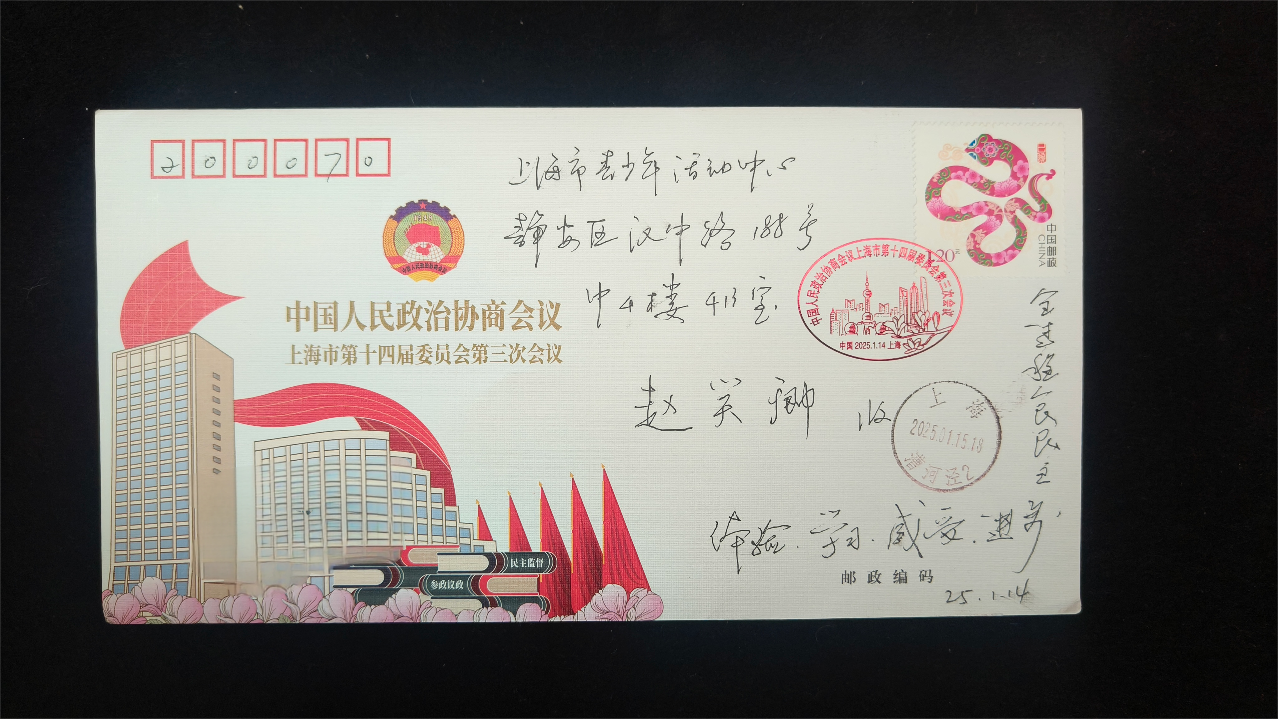 专题讨论后,会议还发放了特别纪念品——中国人民政治协商会议上海市第十四届委员会第三次会议特别纪念封。徐速主任参加本次政协会议特为大队委员会成员赠予该纪念封,并为孩子们写下寄语:“体验、学习、感受、进步”。